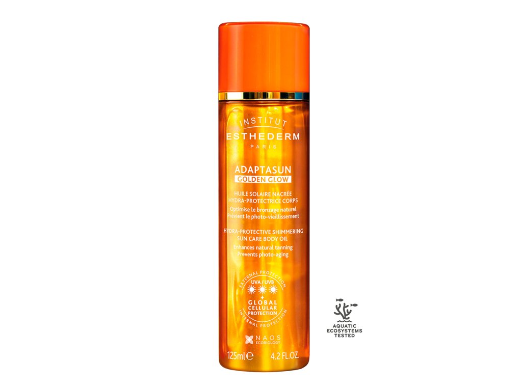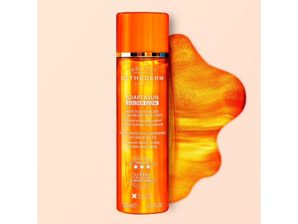 ADAPTASUN Zlatistý opaľovací olej na telo je luxusný trblietavý opaľovací olej, ktorý spája hydratáciu, ochranu pred fotostarnutím a predĺžené opálenie v jednej starostlivosti. Vďaka technológii duálnej ochrany chráni pokožku pred škodlivými účinkami slnečného žiarenia a zároveň podporuje prirodzený proces pigmentácie. Jemná suchá olejová textúra s minerálnymi perleťovými časticami okamžite rozjasňuje pokožku a dodáva jej žiarivý vzhľad.